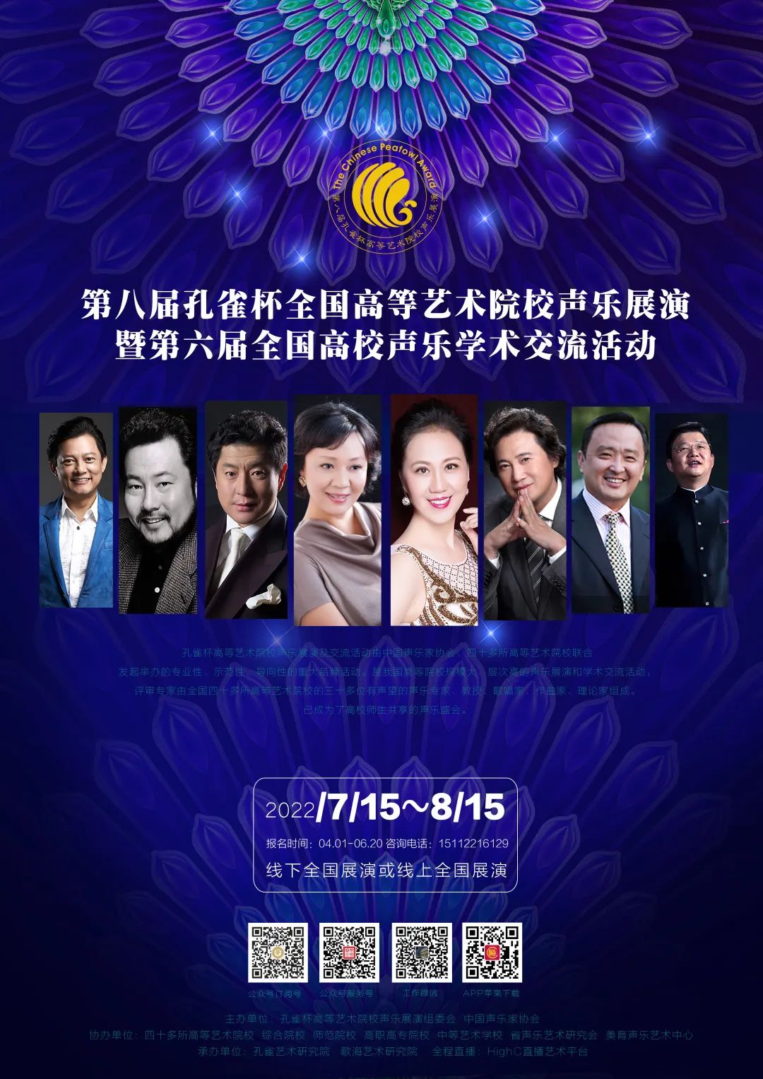 孔雀杯高等艺术院校声乐展演由中国声乐家协会、四十多所高等艺术院校联合发起举办的大规模、高层次的高等艺术院校声乐展演和学术交流的品牌活动,旨在展示高校声乐教学成果、增进学术交流、提高教学质量,通过展演交流为广大青年教师和学生提供展示演唱水平、相互交流、相互学习、共同提高的平台。更快、更多地培养储备一批优秀中国声乐人才,积极推动我国高校声乐教学改革与发展。孔雀杯高等艺术院校声乐展演活动自2008年举办以来,已成功举办了七届,在全国高校广大师生中产生了积极而深远的影响。