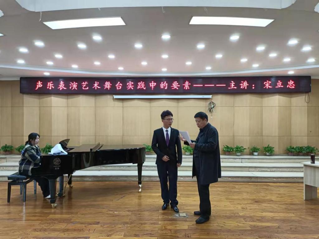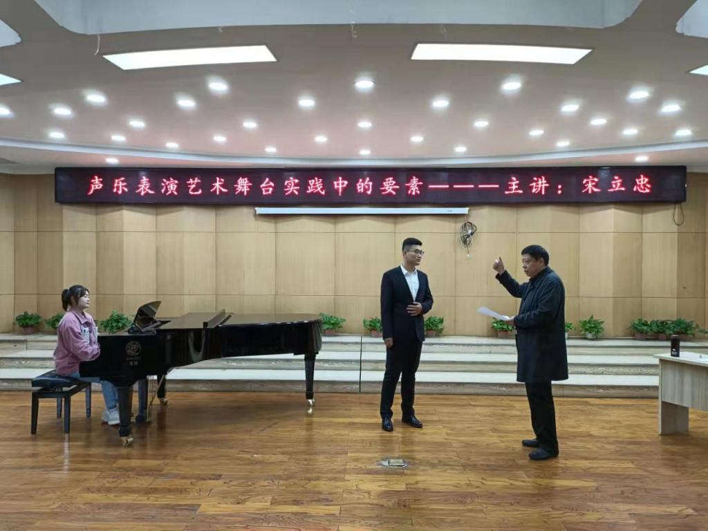 宋教授的讲座严谨,认真的同时又不失风趣幽默。使得同学们在轻松愉悦的讲座氛围中,切实领会到了舞台实践过程中,声乐表演艺术所要注重的关键要素。讲座的过程中,宋教授一再向同学们重申,气息合理科学的运用和歌唱当中高位置的保持,以及良好的积极的歌唱状态,对于每一位歌者都是非常重要的。横膈肌的支撑和共鸣腔体正确的打开,咬字的清晰。作为声乐表演艺术发声技巧方面的必要条件。同时在演唱声乐作品时,应该做到声情并茂、以情带声,建立丰富的情感表现。包括不同角色,人物的声音与肢体表演的配合。也是进一步提高舞台实践过程中作品表现力的关键要素。