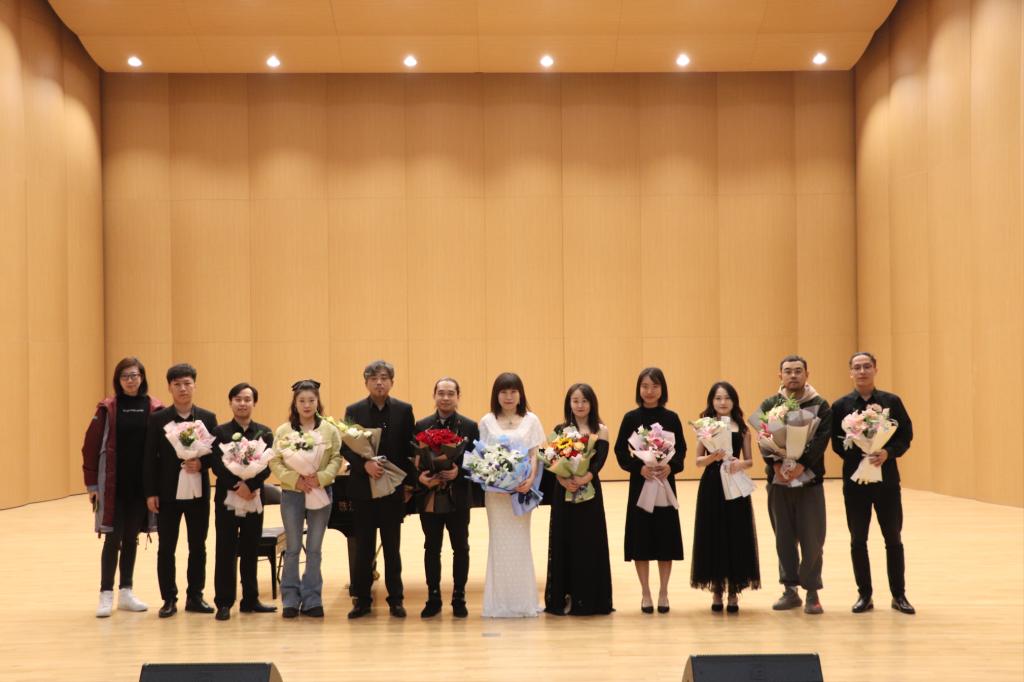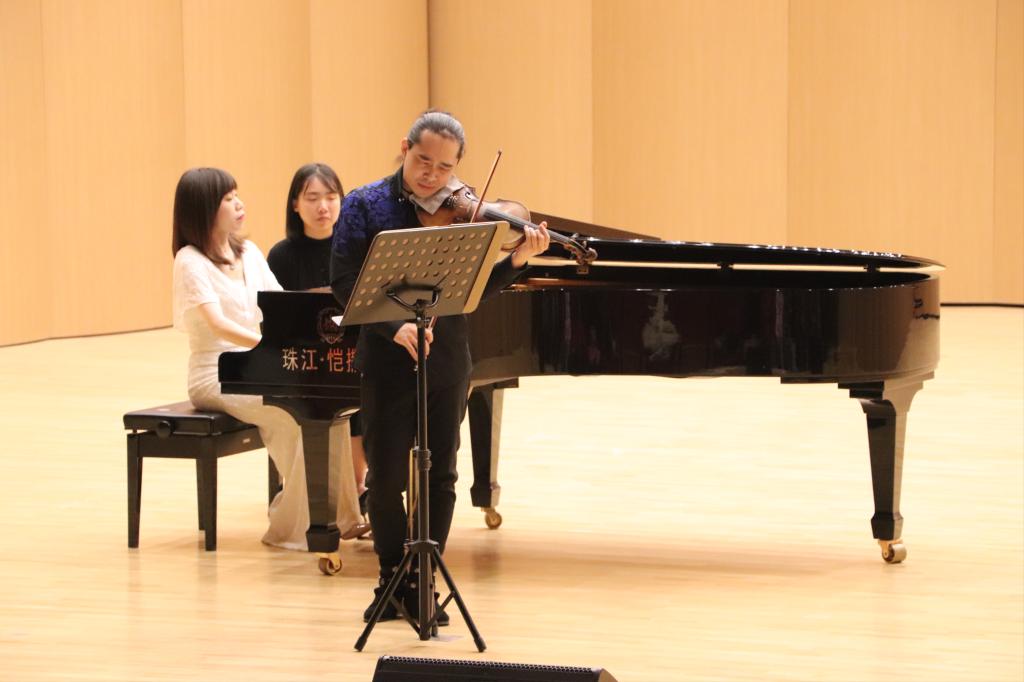 演出中,小提琴演奏充分发挥独特技巧,在音色与情绪的变化中展现出极高的音乐素养和演奏技巧;室内乐的演奏将不同民族的情感发挥的淋漓尽致。王威龙老师与王琼老师携手演奏爱德华-格里格《G大调第二小提琴奏鸣曲op.13》、弗里兹-克莱斯勒《爱之忧伤》、莫里斯-拉威尔《G大调第二小提琴钢琴奏鸣曲第二乐章》、巴勃罗-萨拉萨蒂《卡门幻想曲》、约翰-威廉姆斯《辛德勒名单》、儒勒-马斯勒《沉思》、郑雨贤《望春风》,并与陆晨曦老师演奏巴勃罗-萨拉萨蒂《流浪者之歌》。董睿、温成皓、刘昱西、于鹏华、韩伟威等青年教师中场演绎德米特里-肖斯塔科维奇《五首小品为双小提琴与钢琴而作》、朱塞佩-托雷《D大调协奏曲》。弦音激越、琴声悠扬,呈现了一场无与伦比的绝美视听盛宴,赢得阵阵掌声。