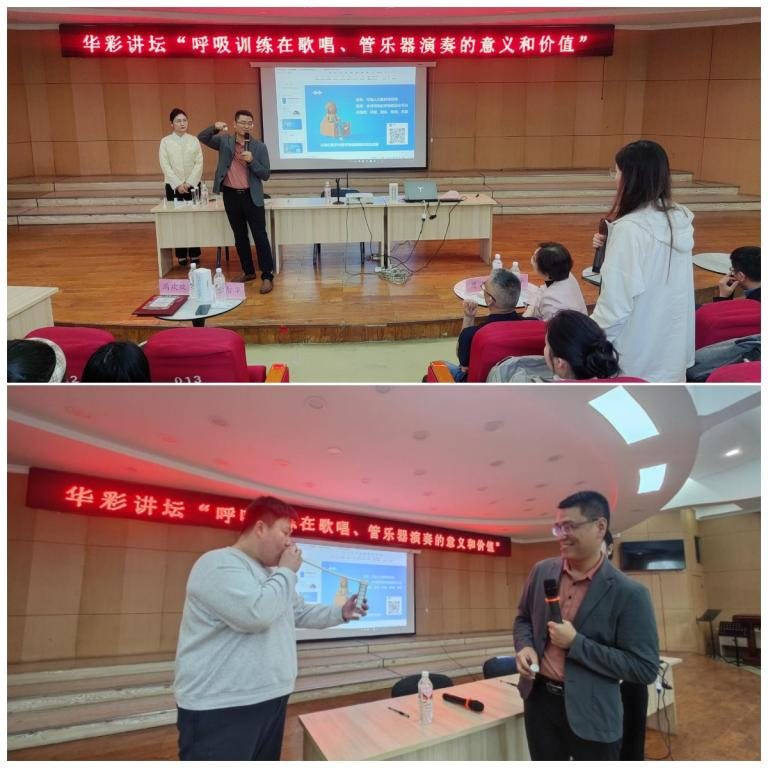 随后,蔡智华先生以“呼吸训练在歌唱、管乐器演奏的意义和价值”为主题,为大家带来一场音乐艺术与科学技术融合的精彩讲座。他通过产品呼吸哑铃引入,深入浅出地讲解了呼吸训练对于艺术表现中的重要性,探讨声乐、器乐及艺术设计如何在本研究中应用等。讲座之后,蔡总与周总一同与在场师生针对该项目以及大学生就业创业等问题进行了交流互动,为同学们答疑解惑。