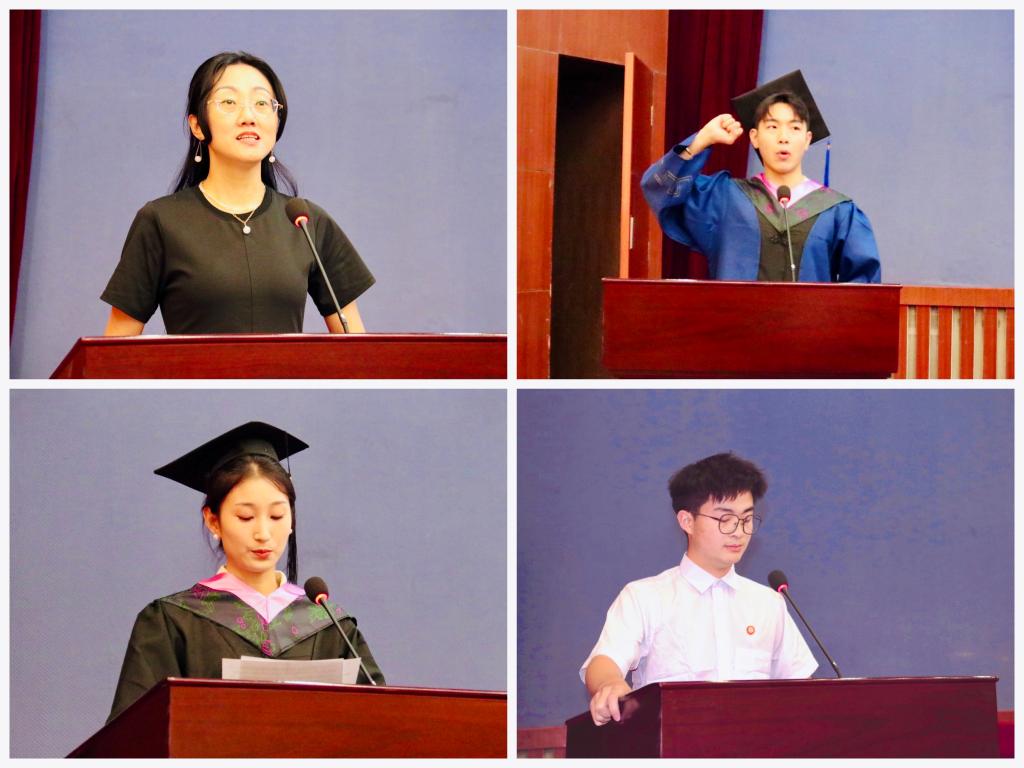 在校生代表何国辉同学表达了对毕业生们的感谢和祝福。感谢当年初来校园,学生学姐在学习和生活中的帮助,同时祝福他们在未来的人生道路上都是熠熠发光、前途似锦。