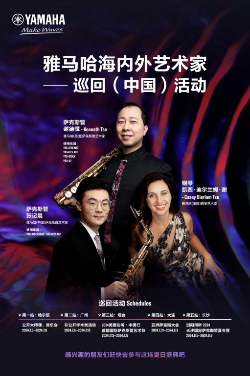 2024年暑期,张记晨博士受邀参与雅马哈公司主办的海内外艺术家中国巡演,与来自美国的萨克斯艺术家Kenneth Tse和钢琴艺术家Casey Dierlam Tse一同在哈尔滨、广州、肇庆、烟台、大连、长沙等多个城市进行音乐会演出及公开课。此次巡演不仅促进了国内外音乐家的学术交流,还进一步提升了博彩平台大全