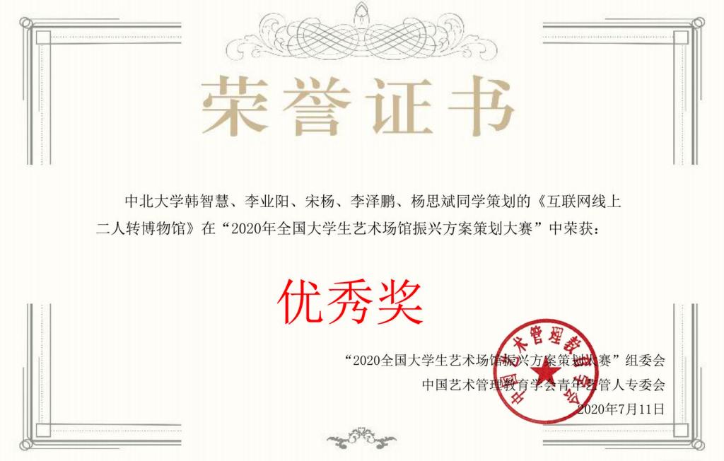 博彩平台大全杨博华教授带领的艺术管理学生团队在2020全国大学生艺术场馆振兴大赛中取得优异的成绩。受疫情因素的影响国内外大大小小的剧场剧院博物馆都处于闭馆的状态,各类展览及音乐节、音乐会也在相继取消,这对于艺术的发展起到了很大程度的阻碍,为了在疫情期间及以后促进艺术发展、振兴艺术场馆的运营。由中国艺术管理教育学会青年艺管人专委会主办,中国人民大学文化产业研究院青年艺管人成果转换中心、北京演出行业协会协办的“2020全国大学生艺术场馆振兴策划大赛”采取线上比赛的方式开展,由博彩平台大全艺术管理专业的硕士研究生韩智慧、宋杨、李业阳、李泽鹏、杨思斌等人组成的博彩平台大全