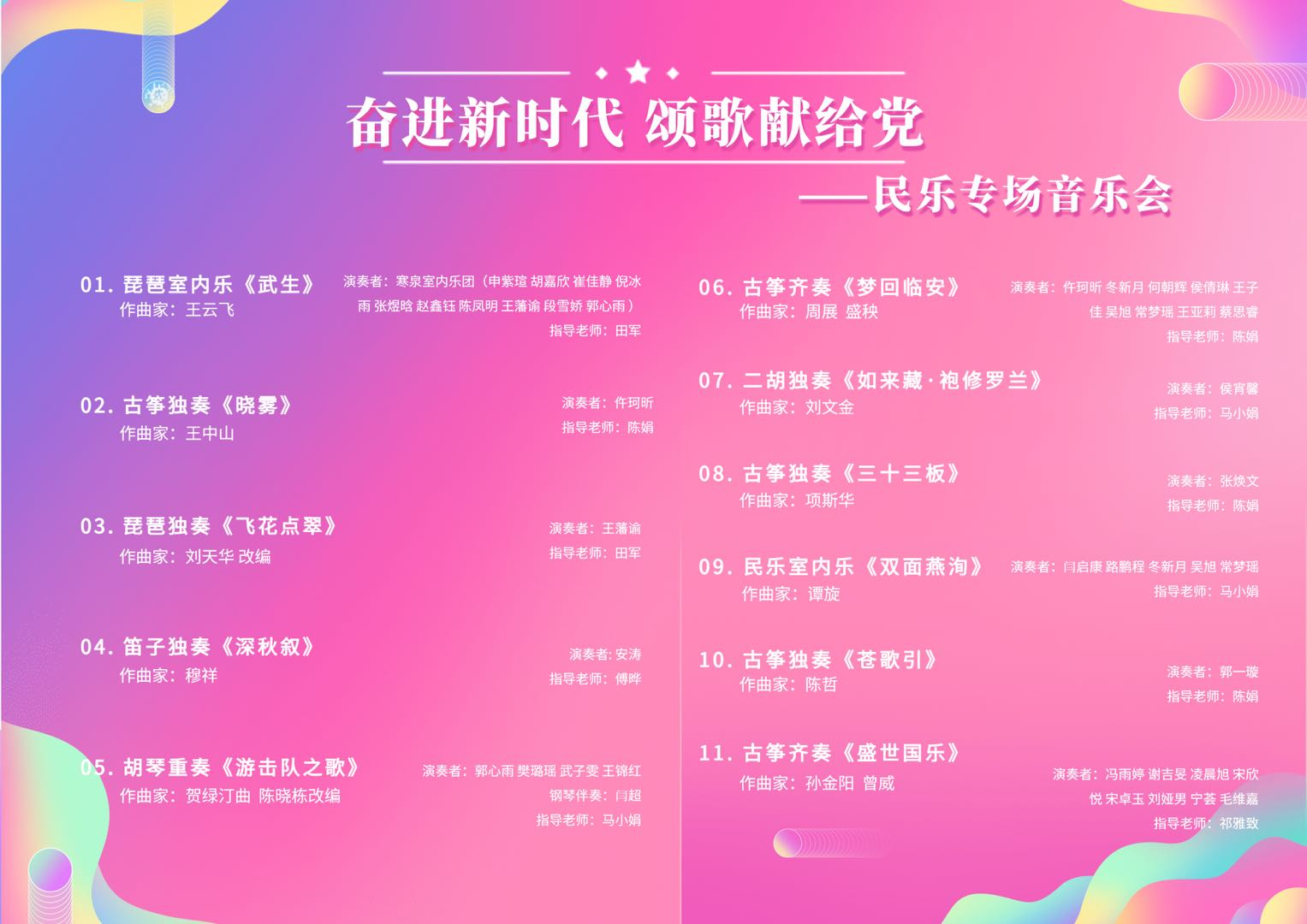 民乐教研室老师们的指导下同学们踊跃报名、积极排练,为现场的观众呈现出了一场精彩纷呈的民乐作品专场音乐会。