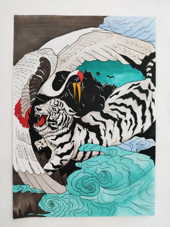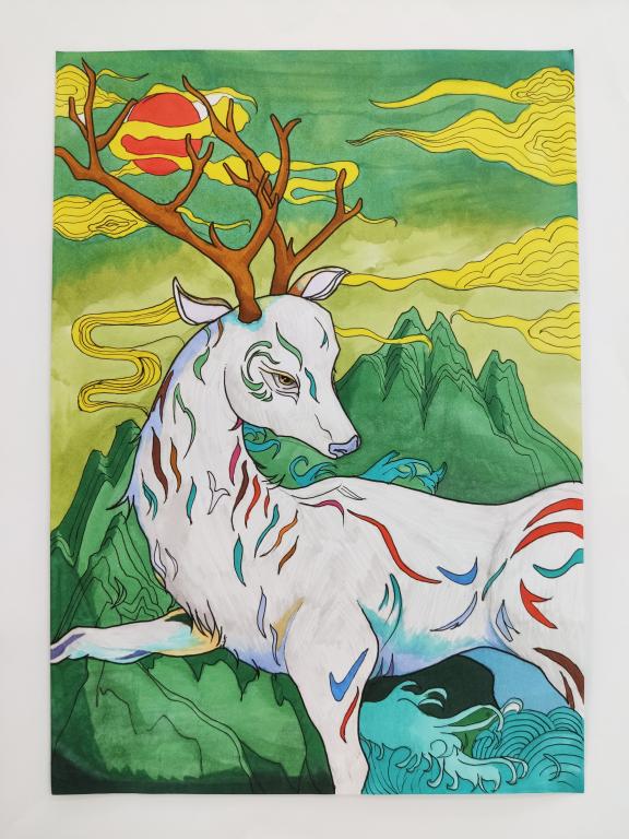 设计介绍:这两张作品以中国传统民间极具地域特色的民间美术形式——炕围画为基础,用板绘的形式表现出传统民间艺术的特点。作品的上下边框采用炕围画中常用的图案样式,两张绘画内容以神兽为主,尽可能还原炕围画的色调和形象,体现民族艺术的魅力,并结合现代设计语言及审美进行适当的改动。