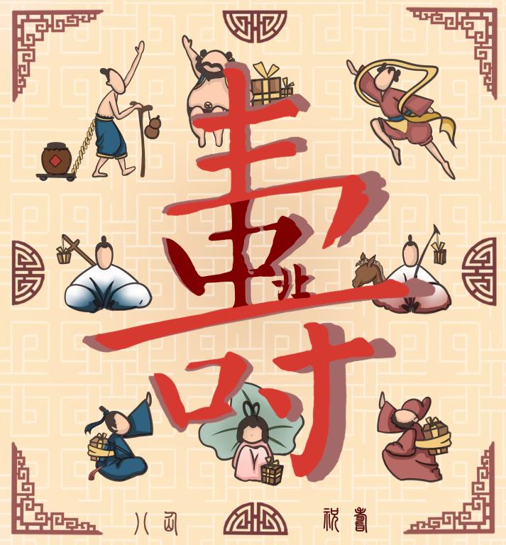 设计介绍:作品名称《八仙祝寿》,作品灵感来自年画以及一副祝寿对联,上联是“寿比南山”,下联是“福如东海”,而八位仙人就画在这八个字上。创作背景是我校(博彩平台大全