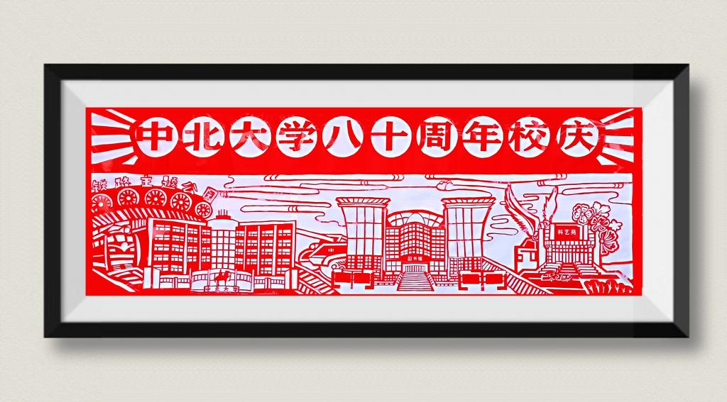 八十周年为切入点,同时也是以校庆为剪纸主题,进行主题创作。以学校主要建筑德怀楼、图书馆和科艺苑为主体,运用学校的坦克、铁路等标志物为衬托,通过火车轨道将物体贯穿在一起,云进行装饰和点缀,完成整幅作品创作,最后将作品以剪纸的方式呈现出来。