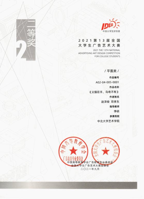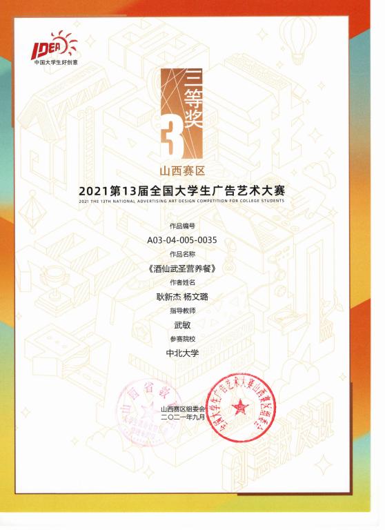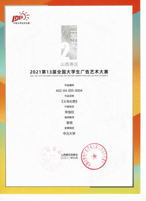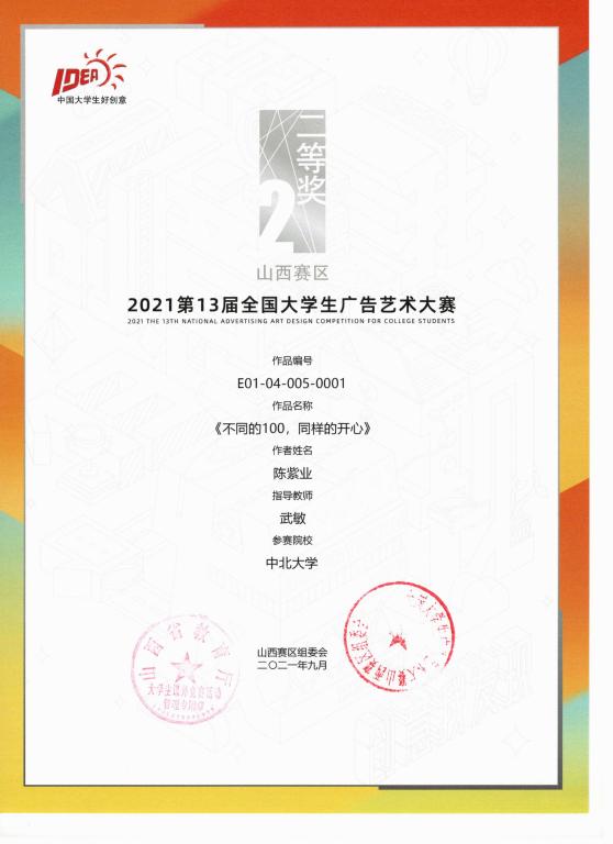积极参与,取得了优异的成绩。我校在今年6月组织校级评审后,报送省赛作品共计119组,其中平面类91组,影视类3件,微电影2件,短视频1件,动画类2件,互动类3件,广播类6件,策划案类11件。经过省赛的严格评选,共有25组作品获奖,省赛获一等奖2项,二等奖3项,三等奖4项,优秀奖16项。选送国赛环节作品中,获二等奖1项,优秀奖1项,实现了国赛等级奖的突破。以下为部分获奖证书,祝贺博彩平台大全