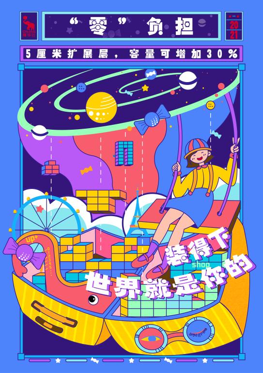 考虑到糖果箱是为新生代群体打造的,在设计时,将爱华仕作为主人公,以两个故事进行讲述,一个故事加入了年轻人物形象代表新生代群体,上方星系代表世界,并将我们所熟知的俄罗斯方块游戏与世界性标志建筑物、服饰等进行结合,意在表现箱体很能装,突出产品的实用性。另一个将飞船作为破坏箱体的反派角色置于画面中,表现受到攻击的箱体没有受到破坏,强调产品的坚固性。最后邀请消费者一同创造属于自己的故事为设计思路。
