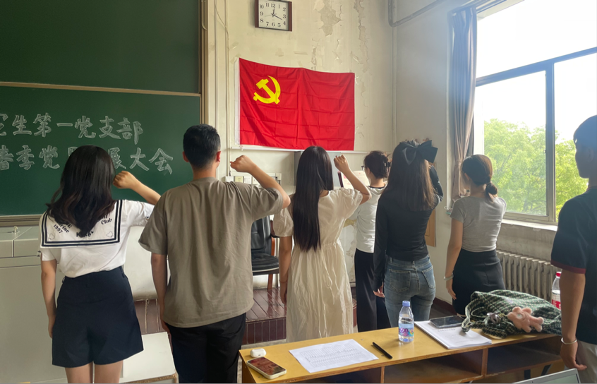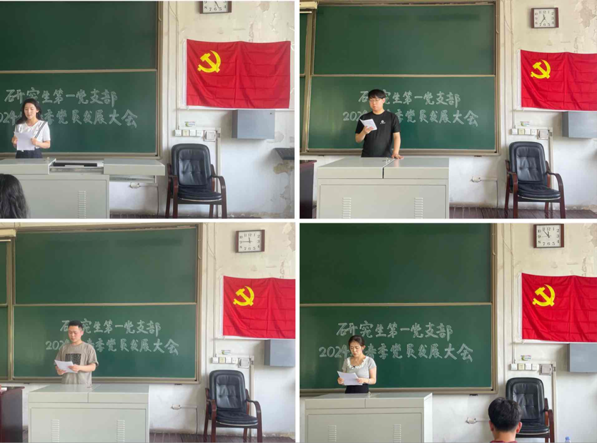 研究生第一党支部在12号楼三层本科生教室召开2024年春季发展党员大会。大会讨论接收王紫薇、张娇、王若旭、崔宇昇4名同志为预备党员的问题。本支部共有党员25名,应到25名,实到25名,未到0人。应到会有表决权的正式党员19名,实到会有表决权的正式党员19名。有表决权的正式党员到会人数超过应到会有表决权人数的半数,符合会议规定人数。