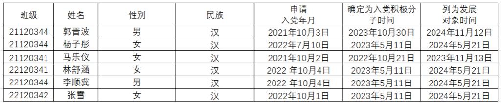 本科生第二党支部于2024年12月16日召开支部委员会,应到正式党员6人,实到6人,经讨论一致同意拟接收郭晋波等6名同志为中共预备党员。现将6名同志的基本情况公示如下:
