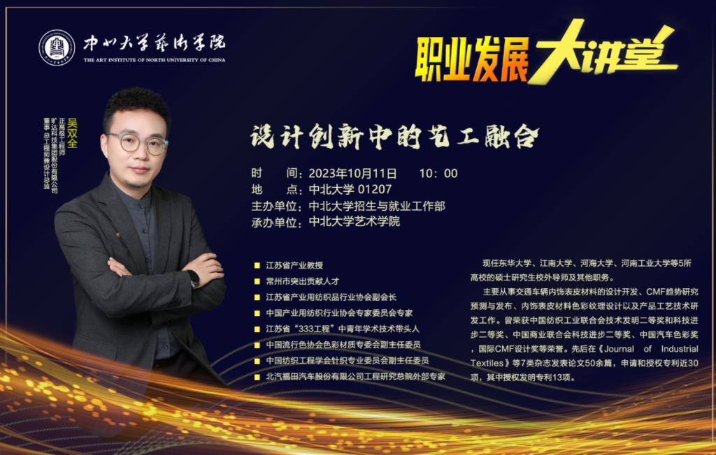 在09526教室举办了题为《设计创新中的艺工融合》专题讲座。本次讲座特邀常州旷达科技集团股份有限公司董事、总工程师兼设计总监吴双全为21级文创设计方向学生作了专题讲座。常州旷达控股集团有限公司董事长兼党总支书记沈介良,博彩平台大全