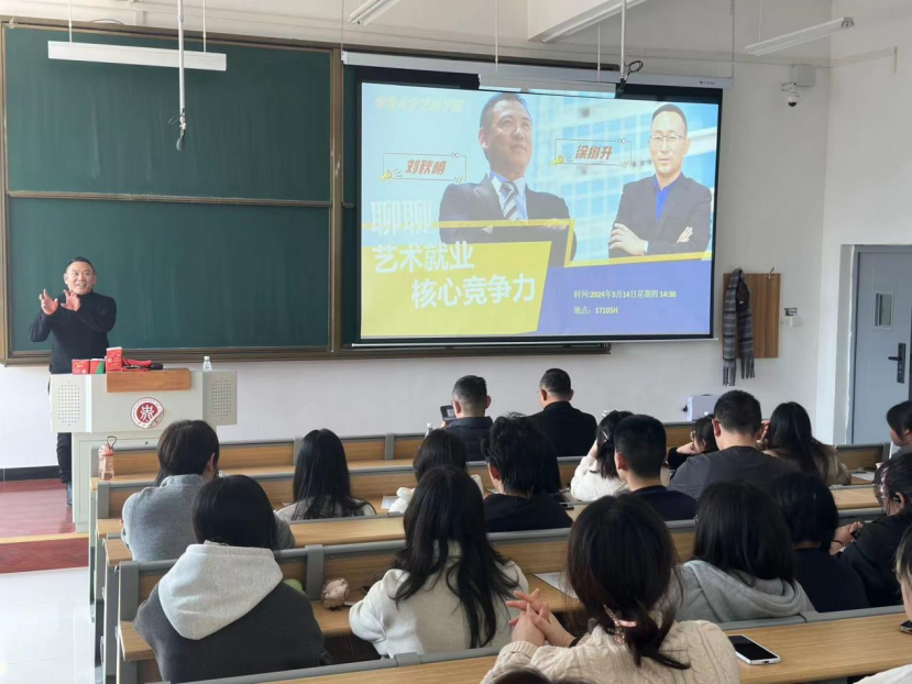 最后校友刘秋明、徐树升与同学们进行了互动,针对同学们提出的问题答疑解惑。在交流过程中刘董提出艺术专业要对AI创造多了解多学习。徐董在解答过程中提到“艺术就是价值”,作为学生在大学阶段要将专业学好,让艺术绽放光芒、创造最高价值,只有自己有价值、更好地为公司创造价值就是在提高自身的竞争力。