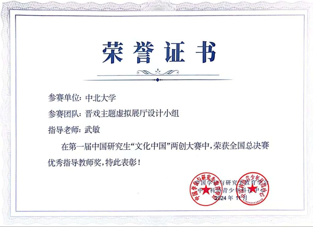 武敏老师指导的3项作品参赛,经过激烈角逐,刘昌骐、秦欢同学作品“晋戏主题虚拟展厅设计”(指导老师:武敏)喜获全国一等奖;郭诗雨同学作品“聆感‘独’韵”(指导老师:武敏)、焦雨珊同学作品“青铜有礼”(指导老师:武敏 夏志丽)喜获全国二等奖,我校也是山西省唯一获全国一等奖的高校。博彩平台大全