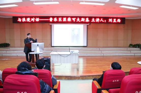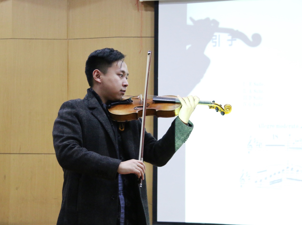刘老师对浪漫主义时期的音乐巨匠柴可夫斯基进行了详细的讲解,并对柴可夫斯基创作的多种体裁的作品:歌剧《叶甫盖尼•奥涅金》、交响乐《1812序曲》、协奏曲《第一钢琴协奏曲》、芭蕾舞剧《天鹅湖》和《胡桃夹子》等,逐一进行了赏析;为了让同学们能全方位的了解柴可夫斯基,刘老师对柴可夫斯基创作的唯一一部小提琴协奏曲—D大调小提琴协奏曲亲自示范演奏,使同学们身临其境,近距离感受到小提琴独特的魅力和绚烂的技巧,享受了一场视听盛宴。