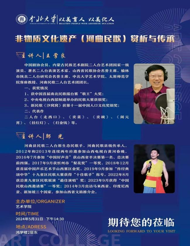鸿学楼二层东报告厅举办了一场别开生面的“非物质文化遗产(河曲民歌)赏析与传承”美育讲座。此次讲座旨在以美育人,以美化人,通过河曲民歌这一独特的艺术形式,激发师生们对传统文化的热爱和尊重。