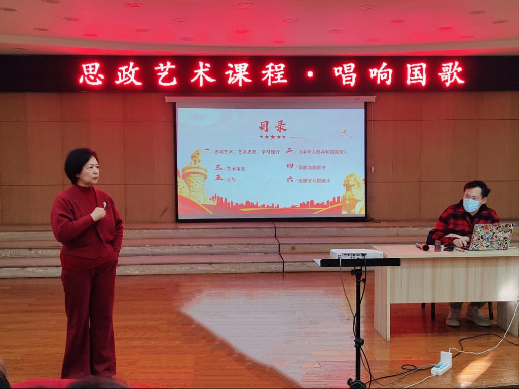 本次活动围绕“思政艺术”与“艺术思政”的核心理念展开,探索了艺术教育与思想政治教育相结合的新路径,以《中华人民共和国国歌》为切入点,深入讲解了国歌的历史背景、创作过程及其所蕴含的国家精神和民族情感。国歌不仅是一首旋律激昂的歌曲,更是中华民族不屈不挠、自强不息精神的象征。艺术审美是美育教育的重要组成部分,它不仅能够提升人们的审美素养,还能够潜移默化地影响人们的思想观念和价值取向。郭教授结合国歌的旋律和歌词,详细分析了国歌所体现的艺术美感和审美价值,引导现场师生从艺术的角度去感受和理解国歌。