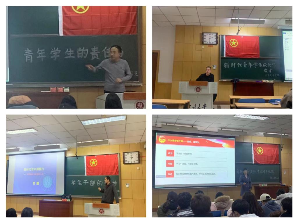 党委副书记贾鹏和学生处毋登辉老师分别就《勇担青春使命,争做青年先锋》、《新时代青年学生成长与成才》、《学生干部的担当》、《青年学生的责任与义务》四个专题开展讲座,对同学们加强集体凝聚力,提高实践学习效率,深入学习中国共产党百年奋斗路,领会中国共产党远大理想和伟大目标等做了详细讲解。